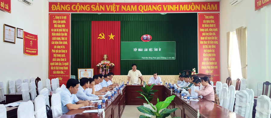 Ảnh: Đồng chí Tống Phước Trường (đứng) - Ủy viên Ban Thường vụ, Trưởng Ban Tuyên giáo và Dân vận Tỉnh ủy làm việc với các xã Vĩnh Hòa Hưng Nam, Vĩnh Hòa Hưng Bắc tại trụ sở xã Vĩnh Hòa Hưng Nam.