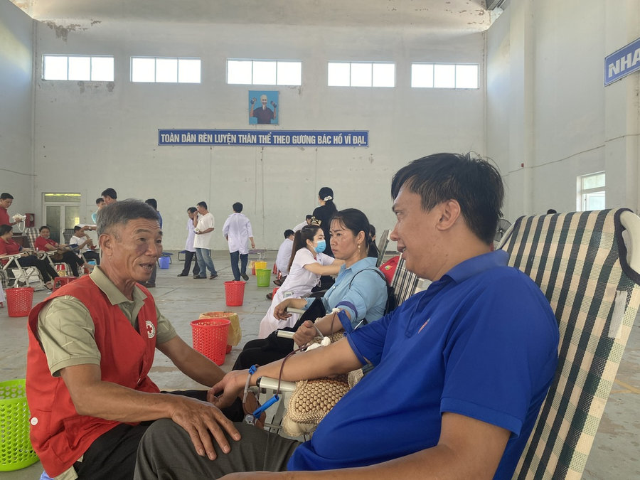 Ảnh: đồng chí Lê Văn Du – Chủ tịch Hội chữ thập đỏ huyện, thăm hỏi tình nguyện viên hiến máu.