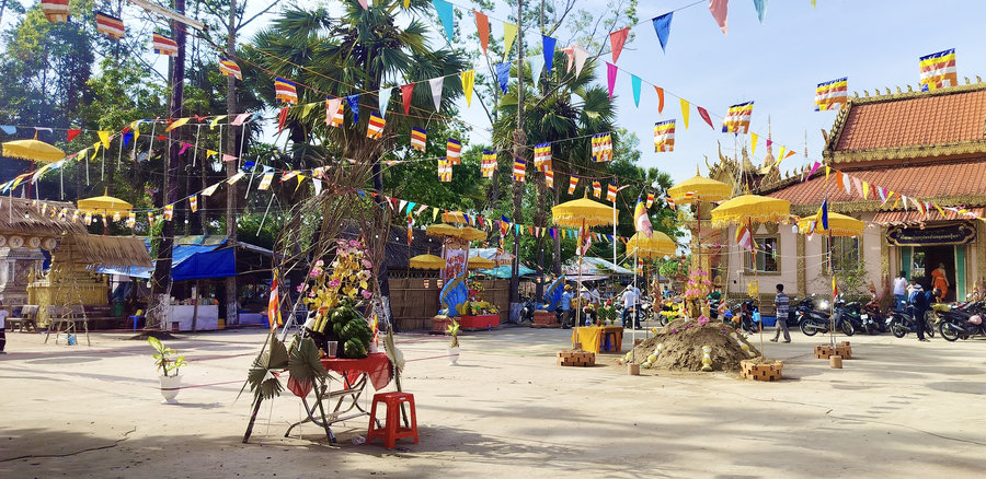Ảnh: Chùa Rạch Tìa, xã Định An trang trí cờ hoa để đón tết Chôl Chnăm Thmây.