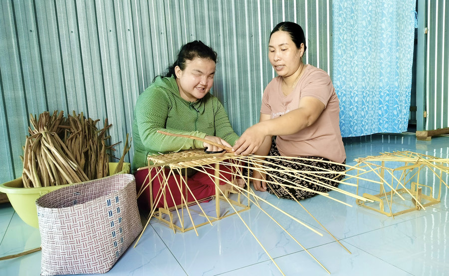 Ảnh: Chị Huỳnh Thị Giới (bên phải) – Tổ trưởng tổ hợp tác đan lục bình ấp Long Đời, xã Vĩnh Tuy hỗ trợ em Mạnh đan sản phẩm từ lục bình.