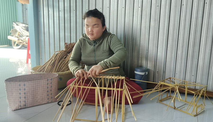 Chị Huỳnh Thị Giới – Chi hội trưởng phụ nữ, Tổ trưởng tổ hợp tác đan lục bình ấp Long Đời, xã Vĩnh Tuy, cho biết: “Thương cảm hoàn cảnh đặc biệt khó khăn của em Mạnh mấy năm qua tôi cùng bà con gần đây đã giúp đỡ em, dành thời gian, công sức kiên nhẫn hỗ trợ cho em đan và hoàn thiện sản phẩm đan từ lục bình để có thêm thu nhập. Theo đó, hàng ngày cứ sáng khoảng 7 giờ là em qua nhà tôi để đan lục bình, em biết đan những kỹ thuật cơ bản còn lại một số công đoạn khó, hay chỉnh sửa sản phẩm cho đẹp, cắt bỏ bớt phần lục bình thừa thì tôi sẽ giúp em hoàn thiện. Cứ như vậy, những năm qua em Mạnh đã biết được nghề đan lục bình, có được công việc kiếm được thu nhập, mặc dù không nhiều, khoảng 1 triệu đồng/tháng nhưng đã góp phần giúp em có thể trang trải cuộc sống, quan trọng là nhờ công việc này em có thể gặp gỡ mọi người giúp em có thêm niềm vui, động lực trong cuộc sống”.
