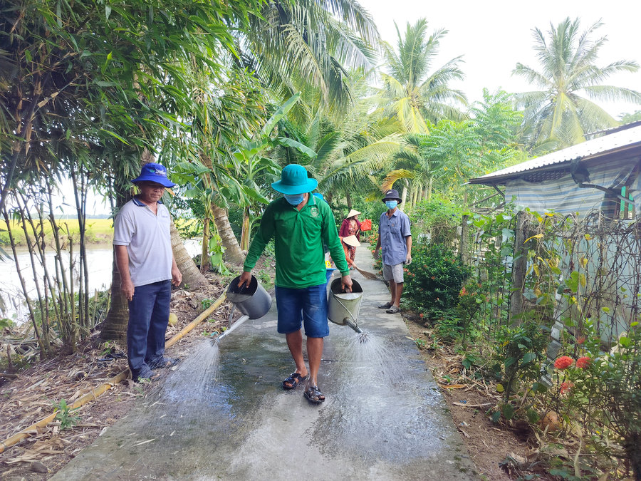 Ảnh: Các thành viên Tổ NDTQCĐ ấp 9 cùng ra quân xử lý rong trơn các tuyến đường trong ấp trong mùa mưa.