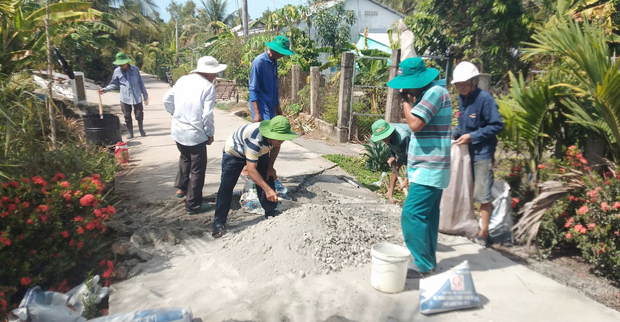 Ảnh: Các thành viên Tổ tình nguyện lắp vá lộ giao thông nông thôn ấp Thới Đông, xã Thới Quản thực hiện sửa chữa đoạn lộ tại tổ 2, ấp Thới Đông.