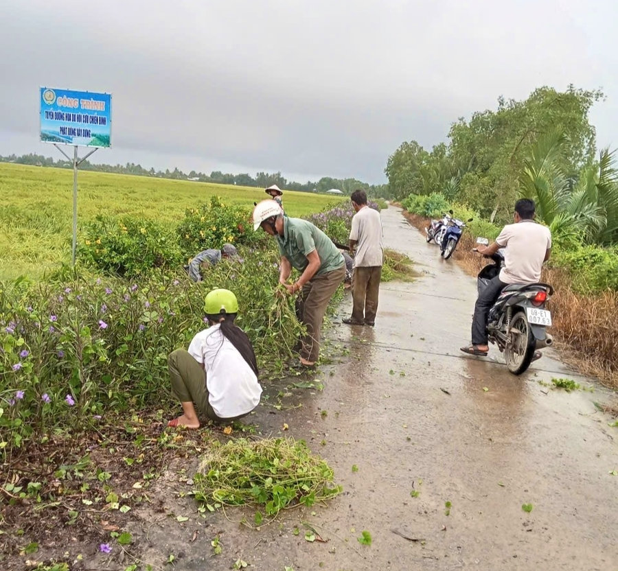 Ảnh: Tổ tình nguyện lắp vá lộ giao thông nông thôn ấp Thới Đông phát hoang, làm cỏ xây dựng tuyến đường hoa trong ấp.